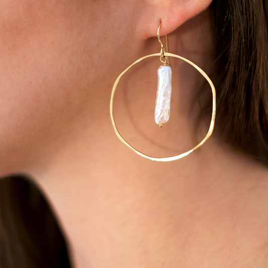 Gold Circle Earrings with Pearl Drop