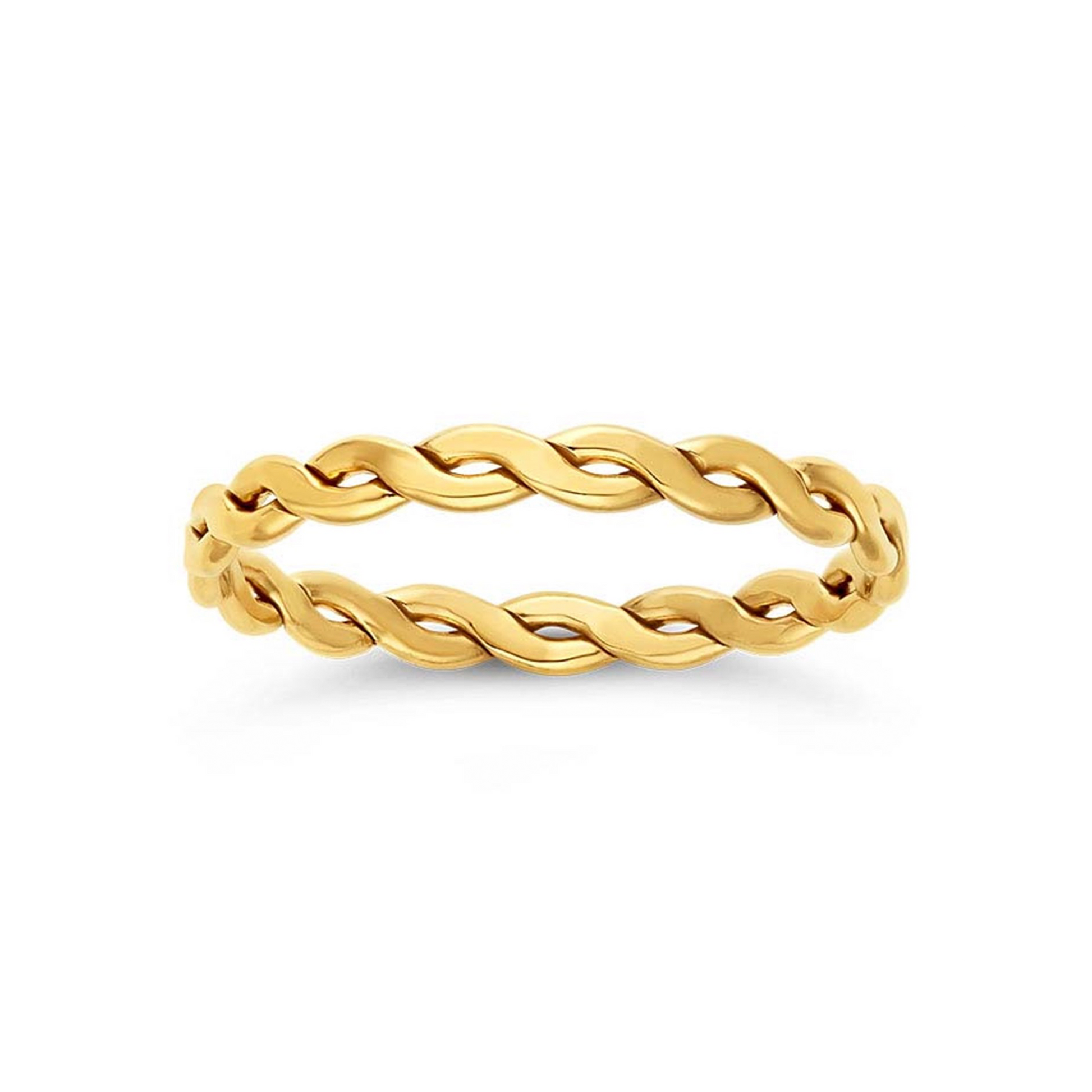 This 14k gold-filled ring is made from flattened wire that is woven into a braided design.