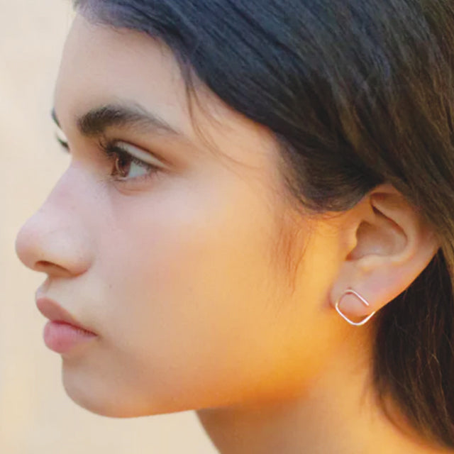 The Rectangle Tuck Studs are a forward facing, rectangular hoop with a twist. They slightly tuck behind the earlobe to create a unique point of interest.