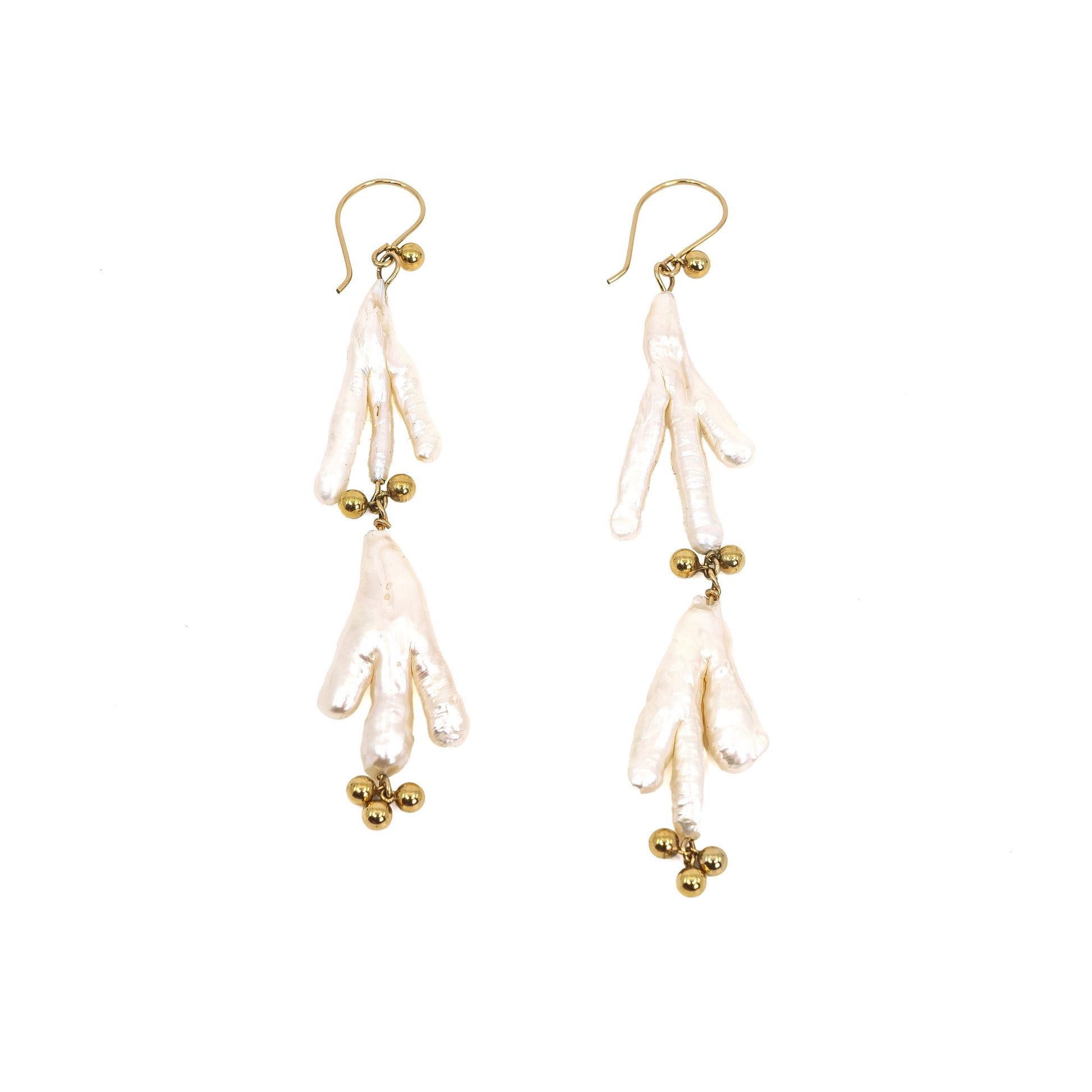 Chicken foot pearls adorned with gold balls on a French hook.