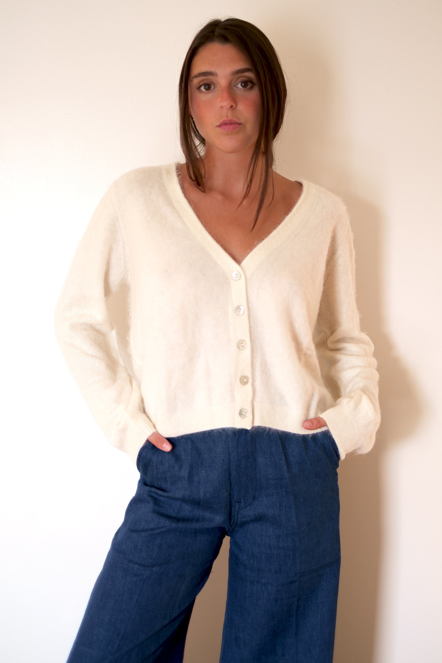 This cardigan is a timeless essential reimagined in ultra-soft, 100% brushed cashmere. Designed with a flattering V neckline and button-down front, it offers a classic silhouette with a plush, elevated feel. The brushed finish adds a layer of warmth and texture, making it the perfect piece to reach for year-round.