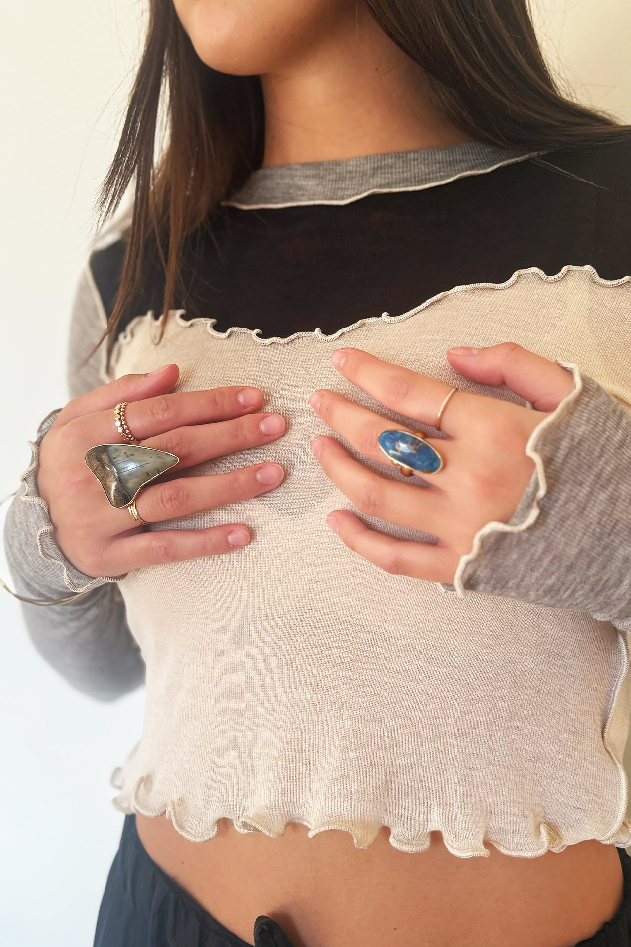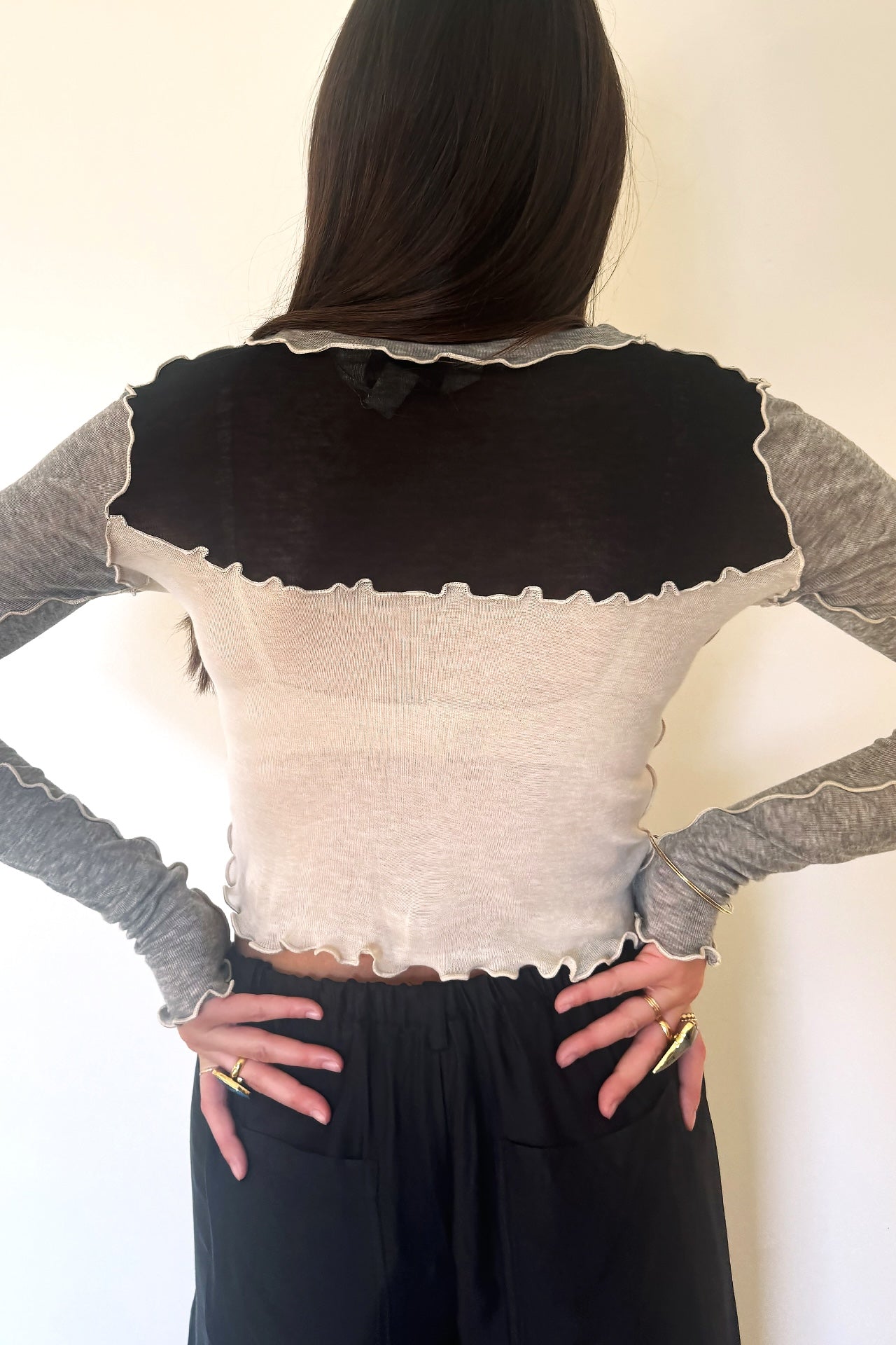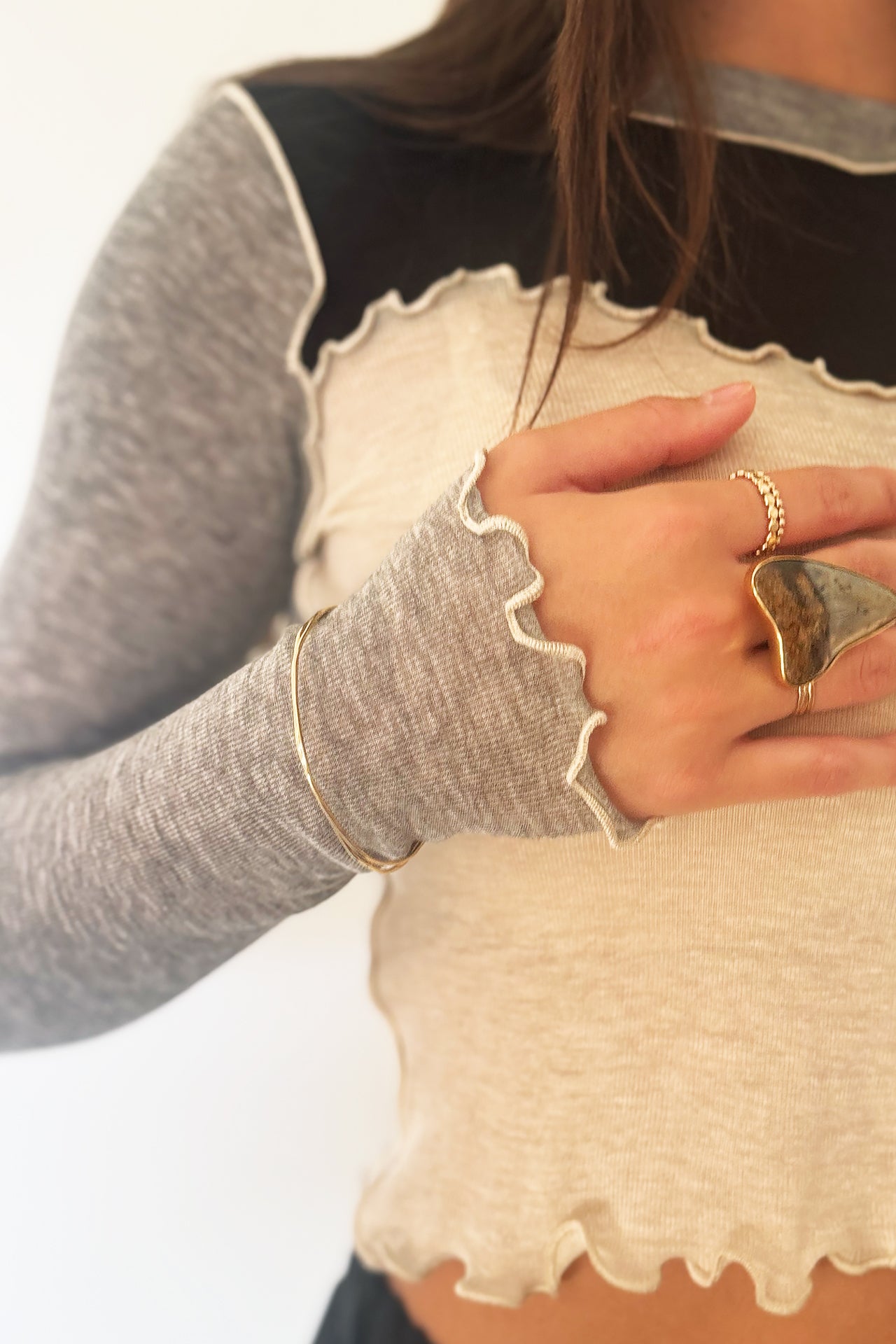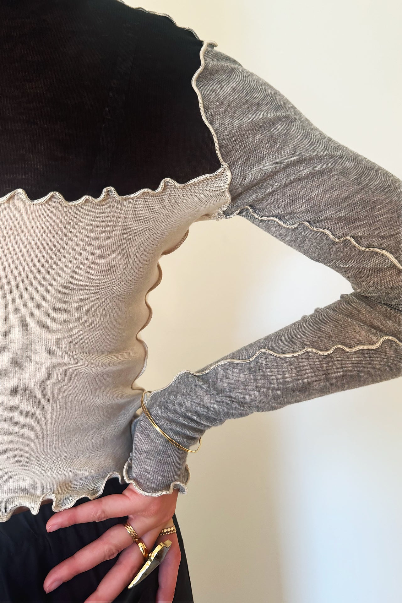 An elevated thermal long sleeve, the Bella top in grey and cream is a colour blocked mock neck tee that has contrasting merrow edge seams and a bold wave detail on the front and back. This top easily makes a statement on its own but is so light and warm that we highly recommend layering it under dresses, sweaters, and jackets of all kinds!
