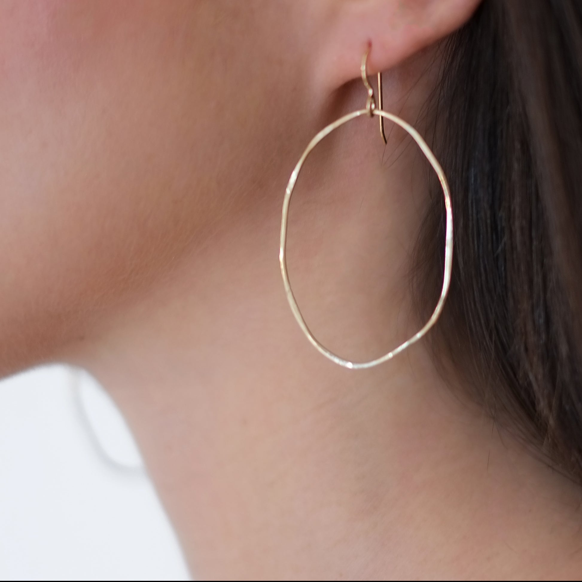 As seen on Kiara in Season 3 of Outer Banks (Kie is wearing the large size in gold). Large scale, yet delicate, organic, and lightweight irregular hoops that hang from french ear wires. 3.5" long. Smaller version is 2.25" long. Available in either 14k gold filled or mixed metal (hoop in oxidized sterling silver with 14k gold filled French hook).