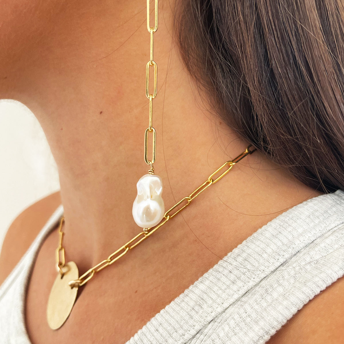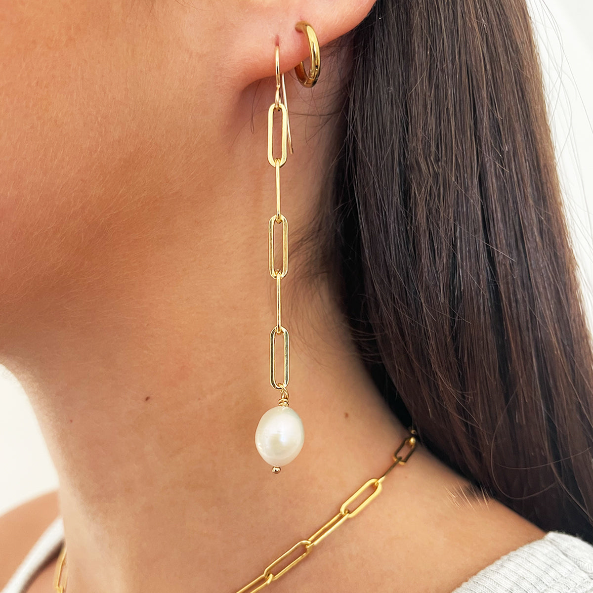 A classic pearl drop earring with 3 different lengths to choose from. 3 links for an elevated everyday staple, 5 links for a bit more drama, or 7 links for a mega statement. Pearl size increases with each length to keep the proportions in check. All suspended from 14k gold filled cable chain and french ear hooks.