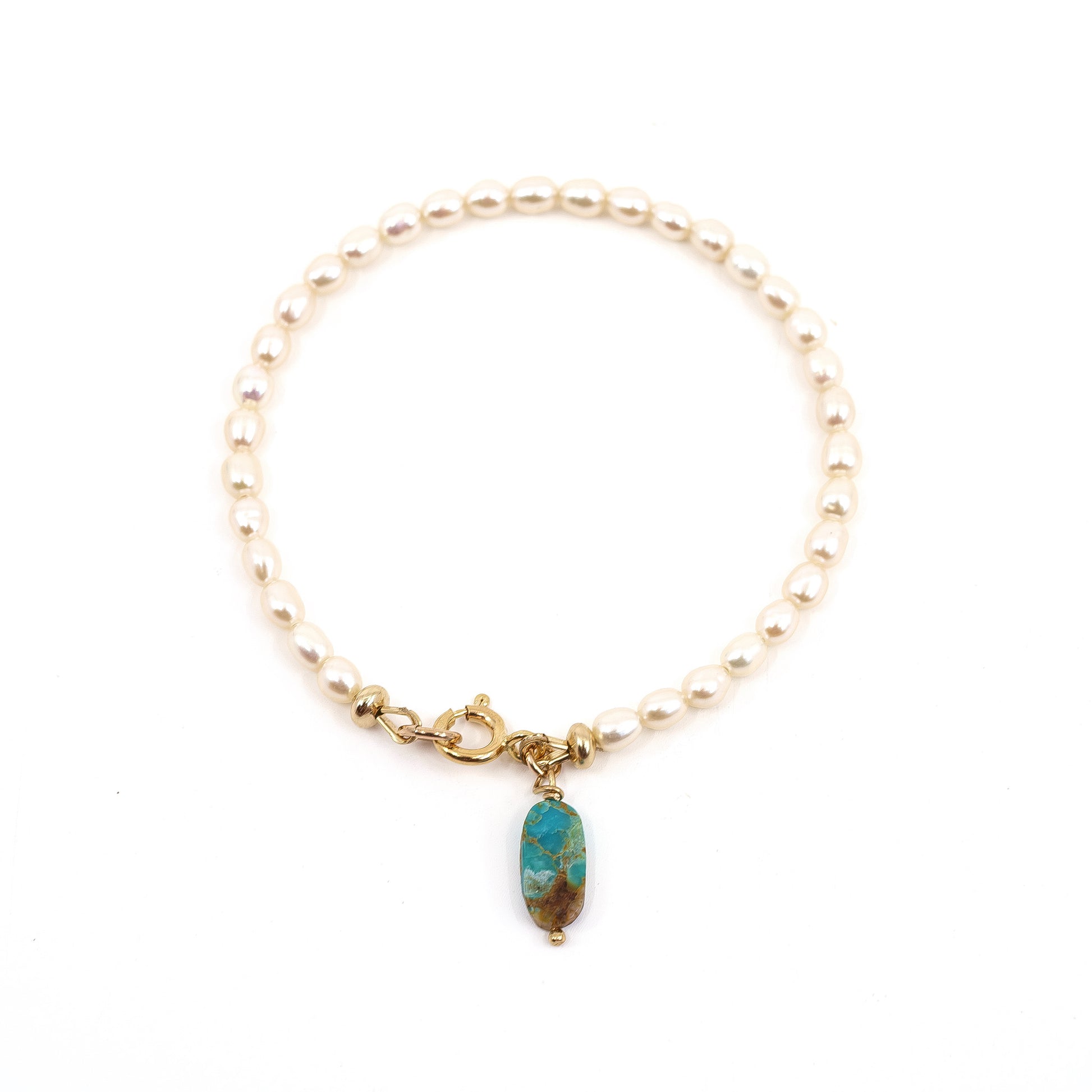 Add a touch of summer to your wrist! This bracelet has a string of pearls with a turquoise drop and 14k gold filled clasp.