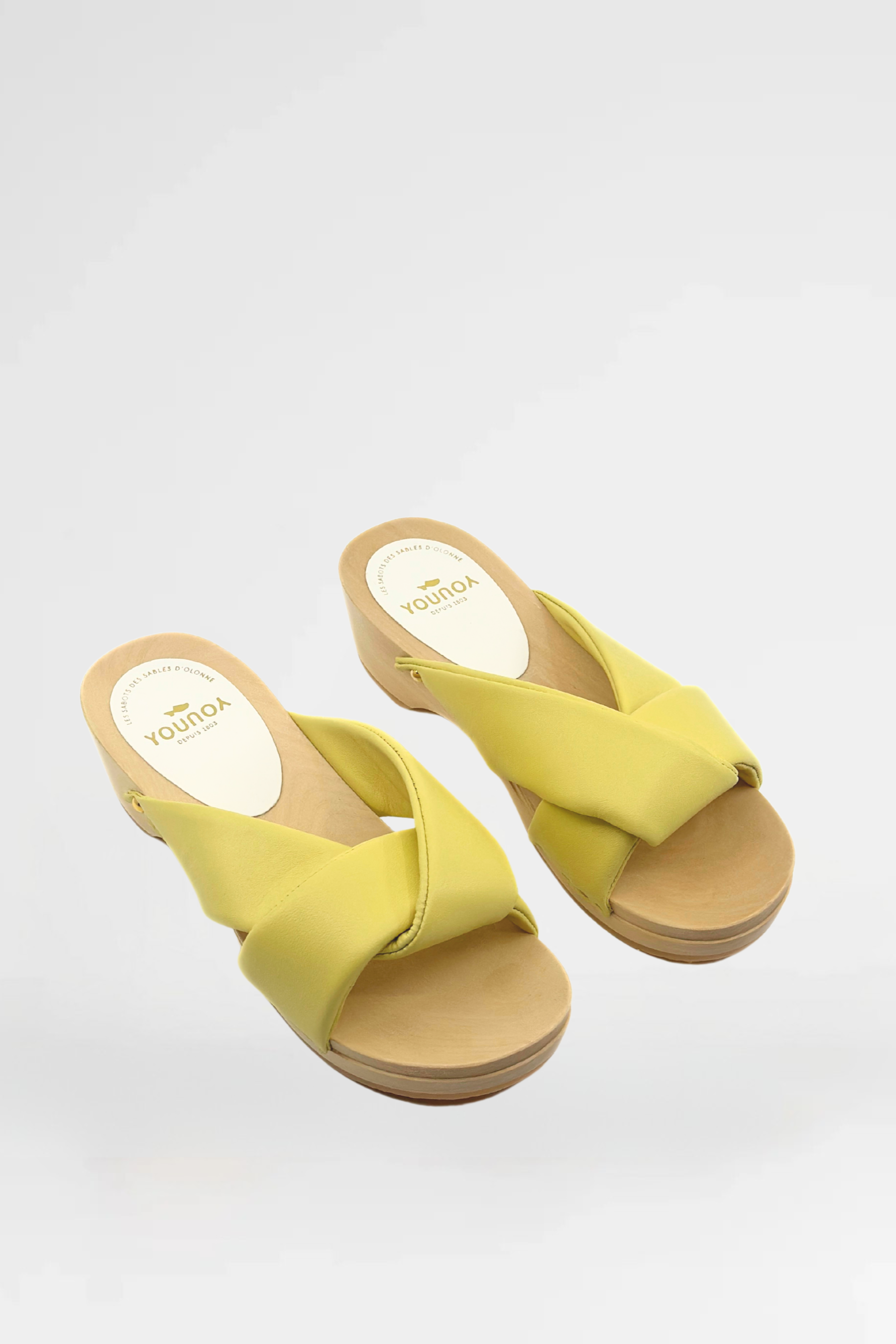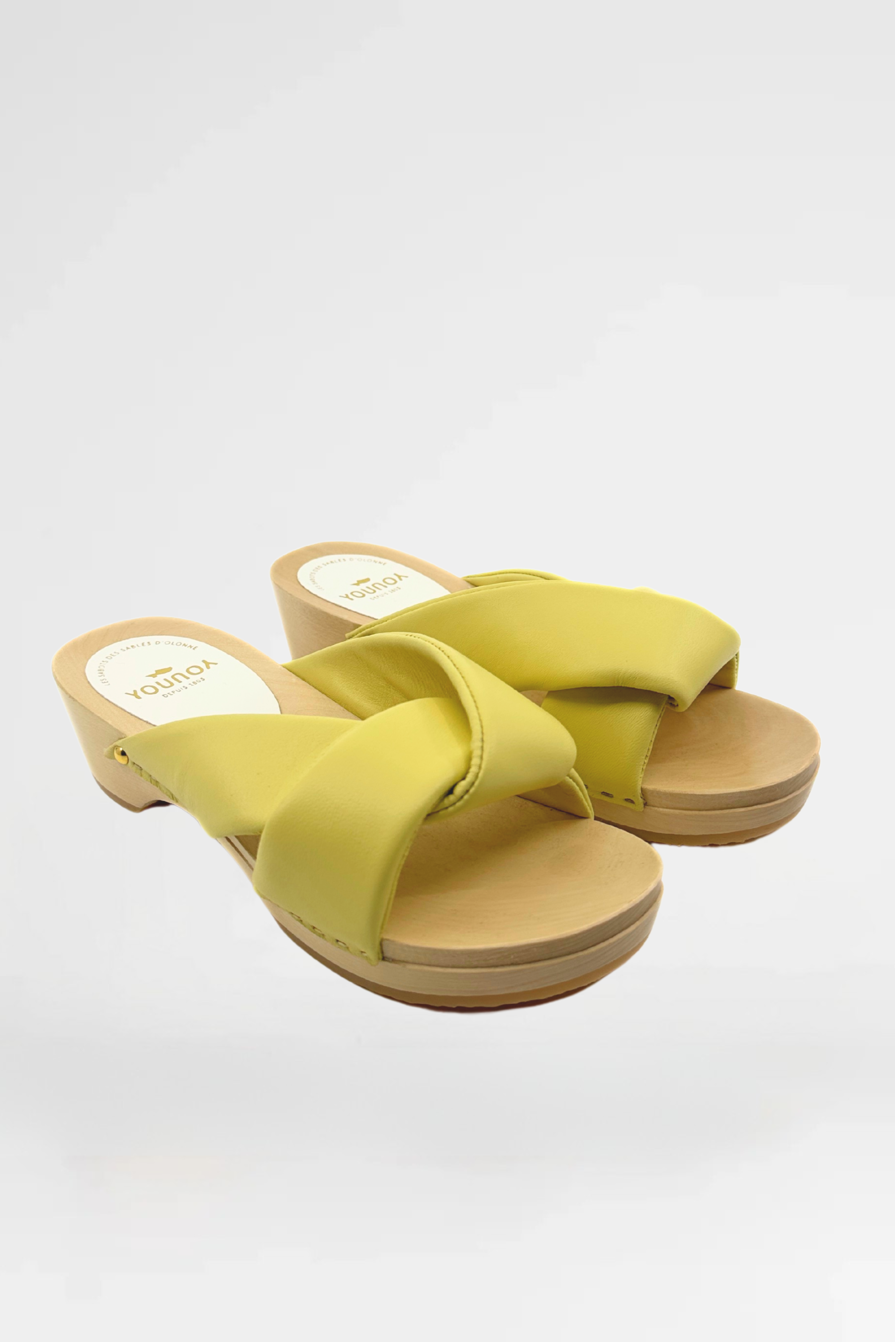 The Yapi mule clogs in a gorgeous soft leather butter yellow. Heel height: 1.75"