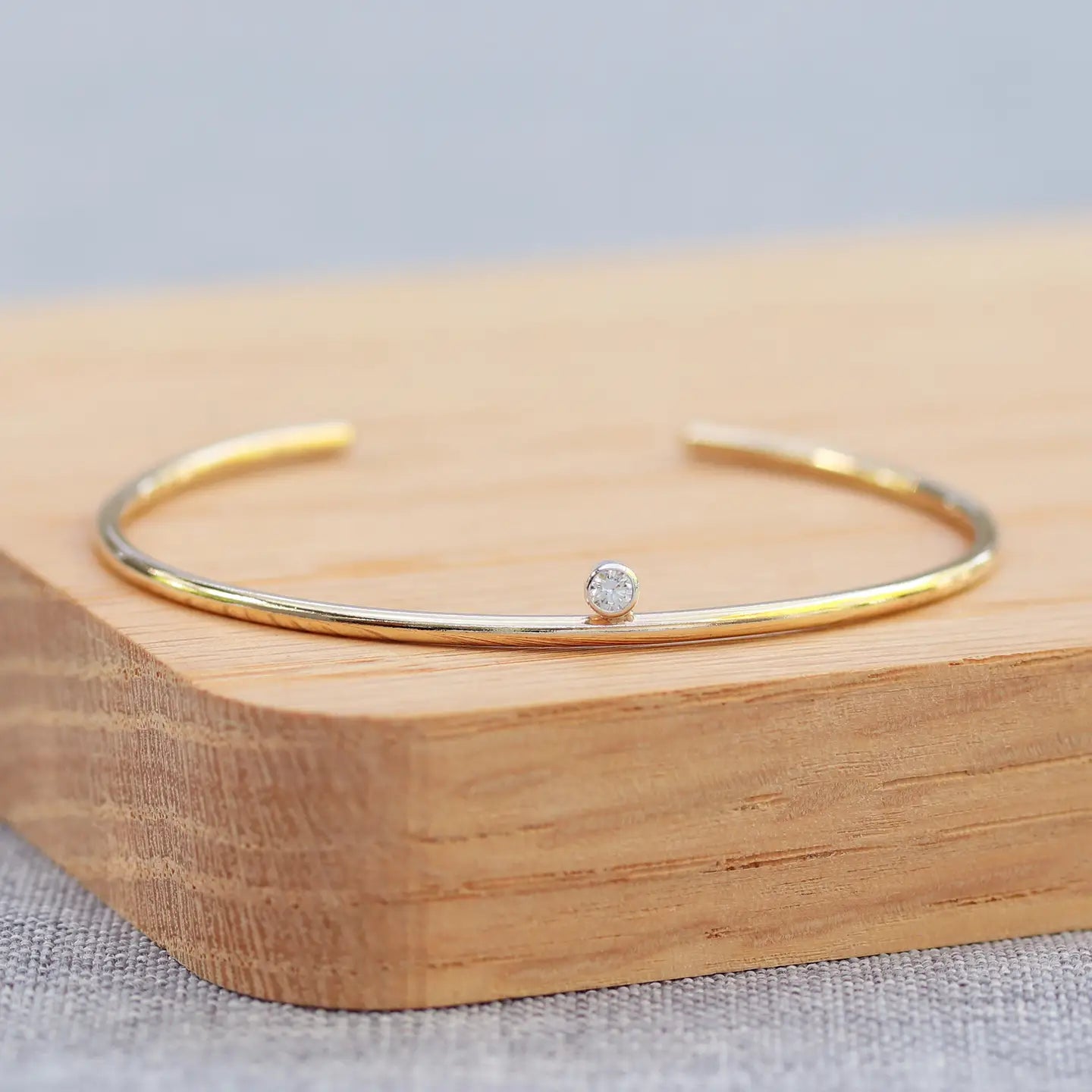 A simple cuff with a little sparkle. This cuff is adjustable and one size fits most. 14k gold filled. Features a 3mm cubic zirconia.