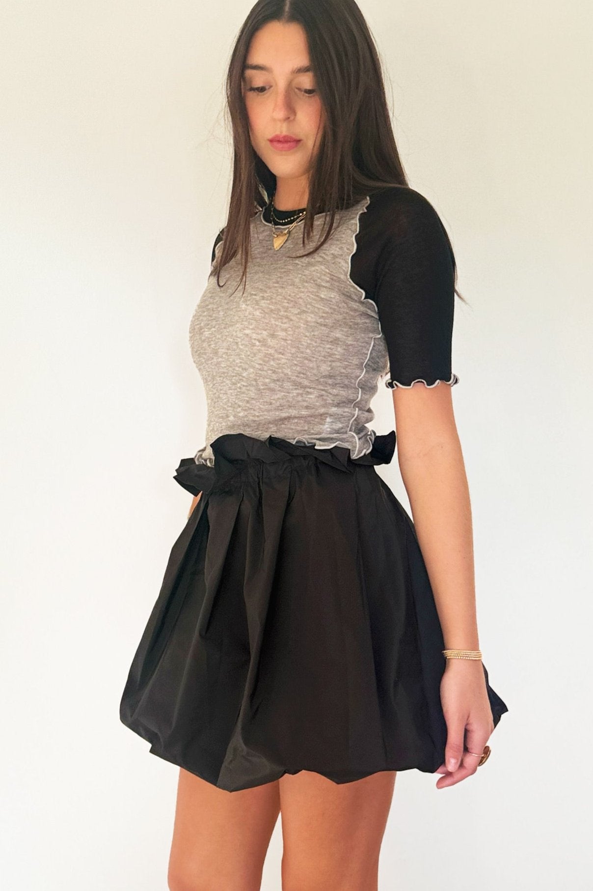 Our black 'balloon' style mini skirt. It has an elastic waistband with pleats.