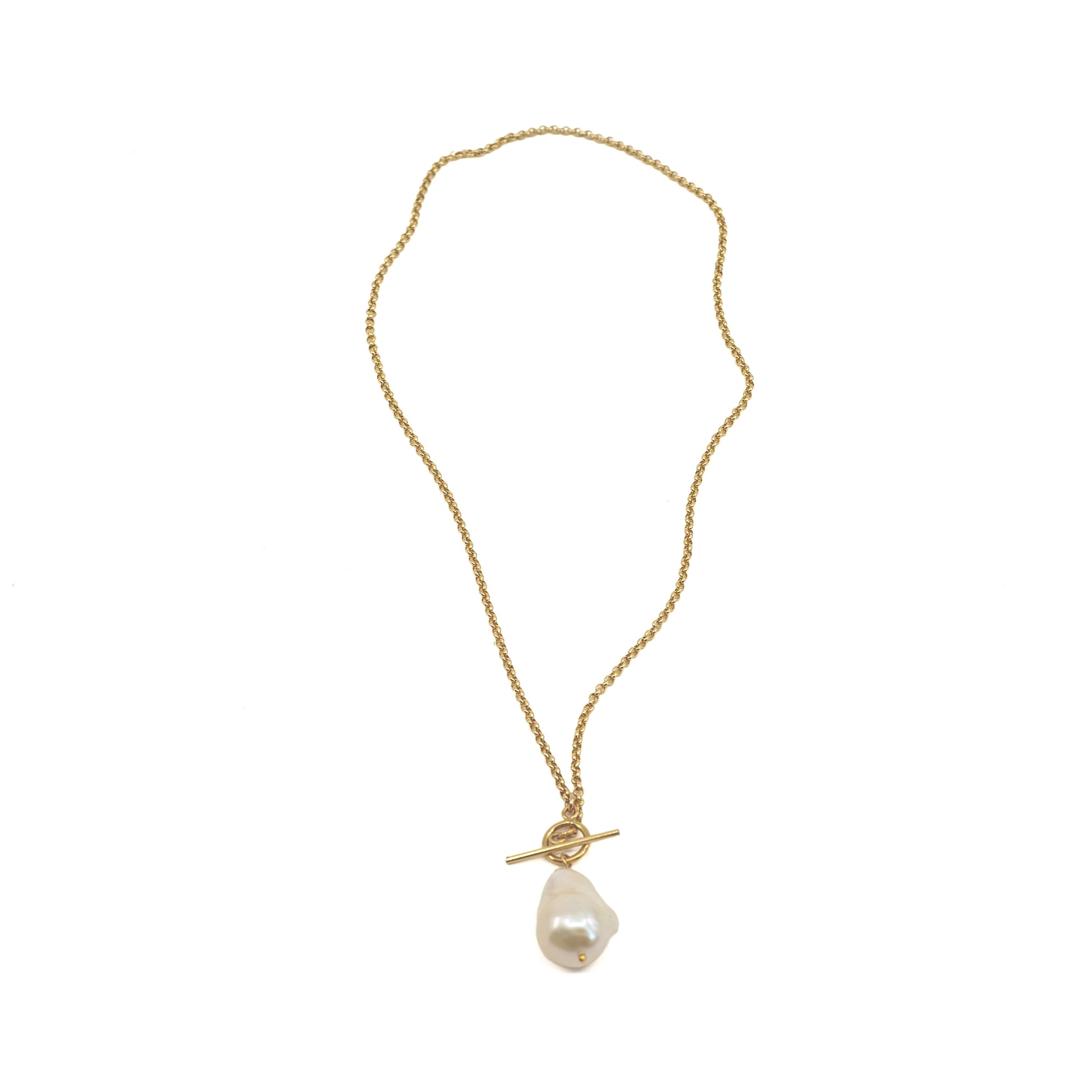 Classic with a twist. We love the toggle clasp hanging in the front of this necklace, adding to the design while also making it super easy to get on and off. Single statement pearl drop gives the ‘Wow’! 16" long, 14k gold filled rolo chain.